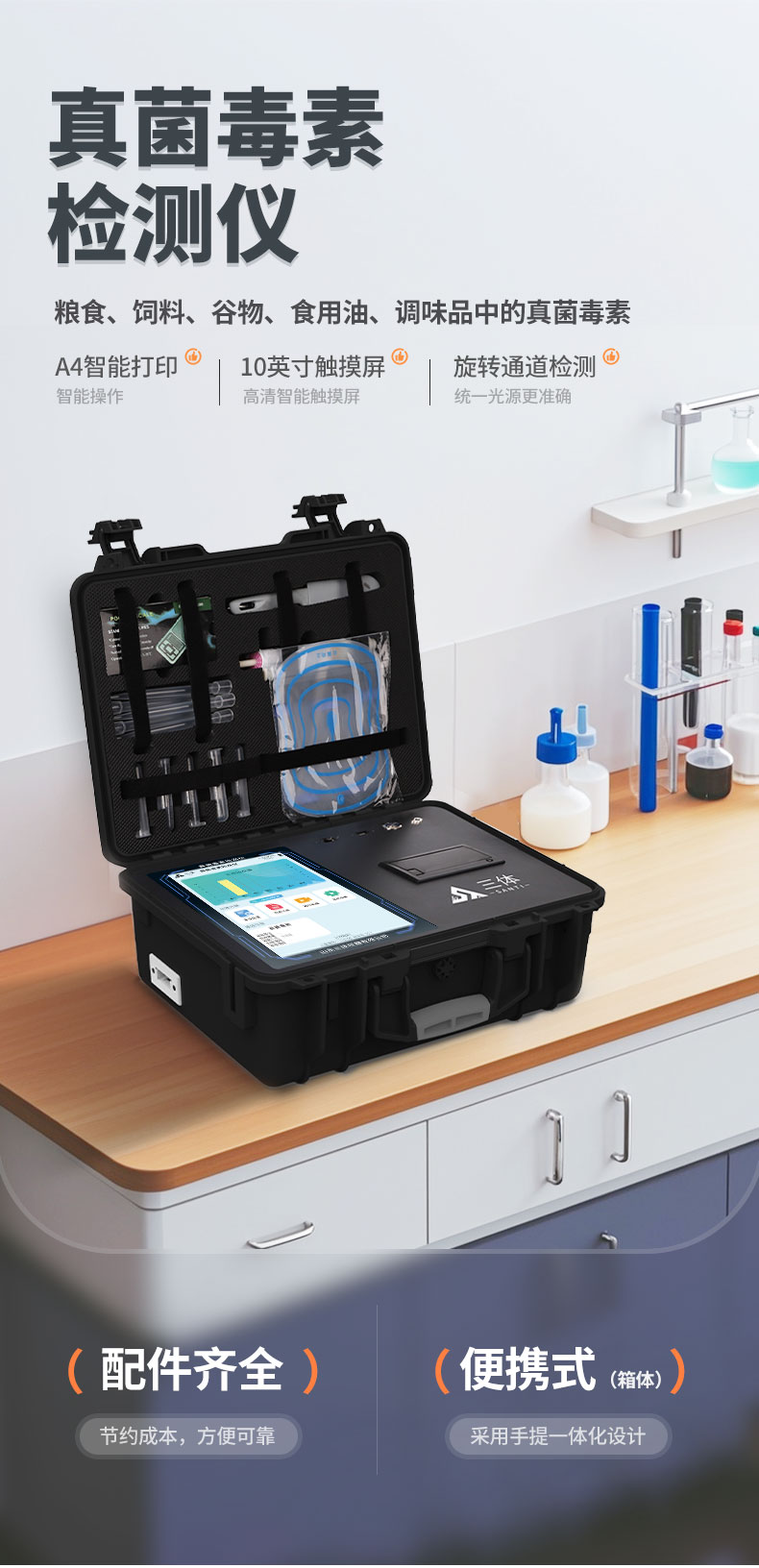 3、一體化便攜式快檢設(shè)備,采用交直流兩用供電方式,可連接車載電源,配備6ah大容量充電鋰電池,可以滿足現(xiàn)場及流動檢測使用的需求。儀器尺寸:43×35×20cm,   主機凈重:5.1kg