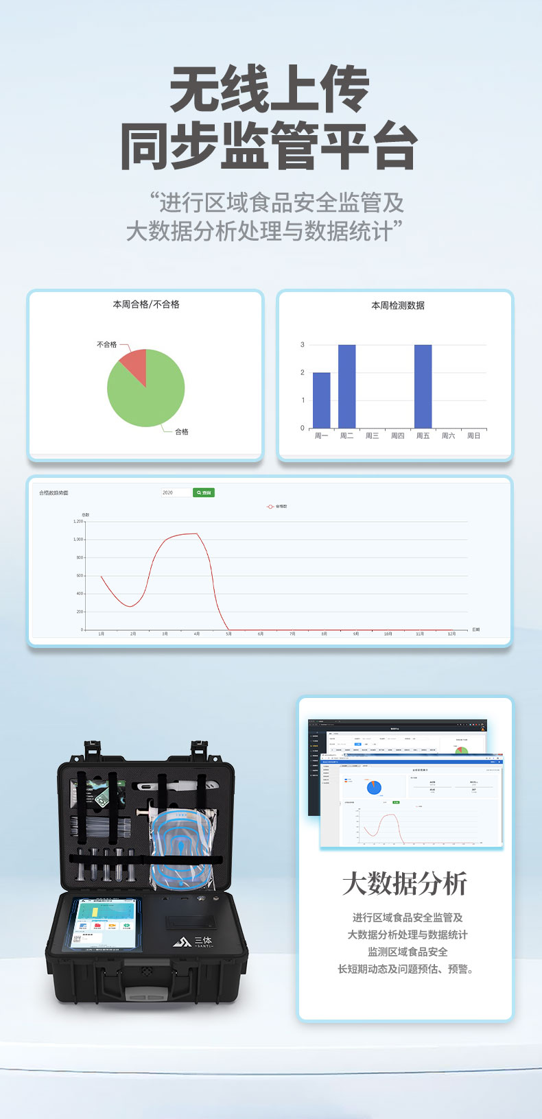 11、儀器具有 wifi 聯(lián)網(wǎng)上傳、RJ45網(wǎng)線連接功能,可以快速上傳數(shù)據(jù)。同步對接監(jiān)管平臺,數(shù)據(jù)可局域網(wǎng)和互聯(lián)網(wǎng)數(shù)據(jù)上傳,檢測結(jié)果直接傳至食品安全監(jiān)管平臺。進行區(qū)域食品安全監(jiān)管及大數(shù)據(jù)分析處理與數(shù)據(jù)統(tǒng)計,檢測區(qū)域食品安全長短期動態(tài),達到食品安全問題預估、預警。