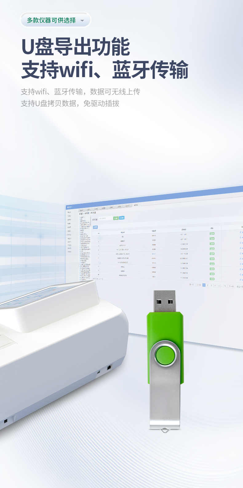 5、支持wifi、藍(lán)牙傳輸,數(shù)據(jù)可無線上傳;支持U盤拷貝數(shù)據(jù),免驅(qū)動(dòng)插拔。