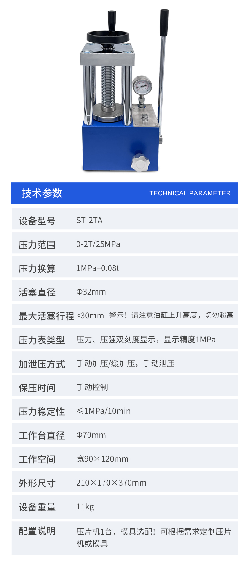 配置說明壓片機1臺,模具選配,數(shù)顯表選配!可根據(jù)需求定制壓片機或模具
