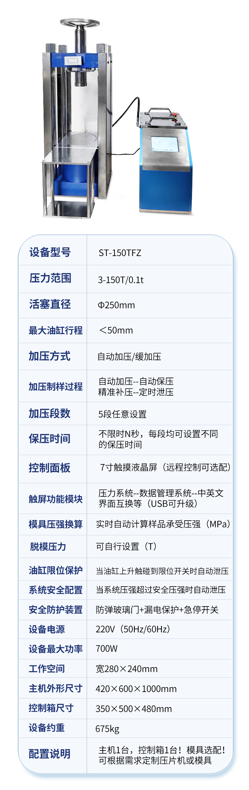 | 模具壓強換算 | 實時自動計算樣品承受壓強(MPa) |