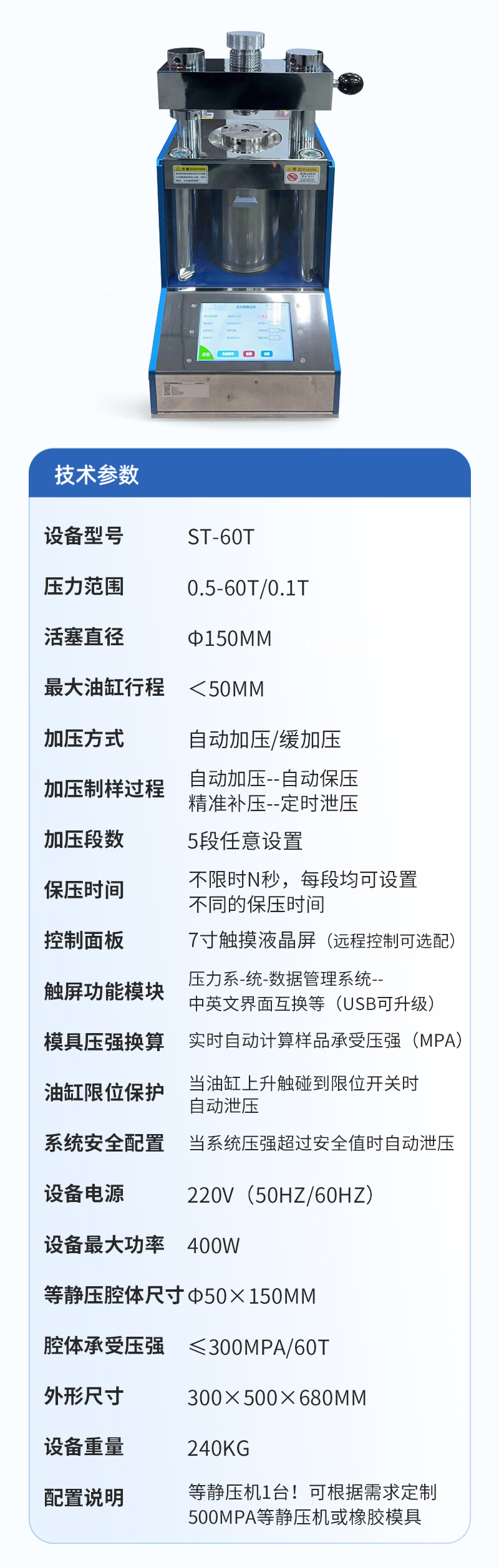 | 配置說(shuō)明 | 等靜壓機(jī)1臺(tái)!可根據(jù)需求定制500MPa等靜壓機(jī)或橡膠模具 |